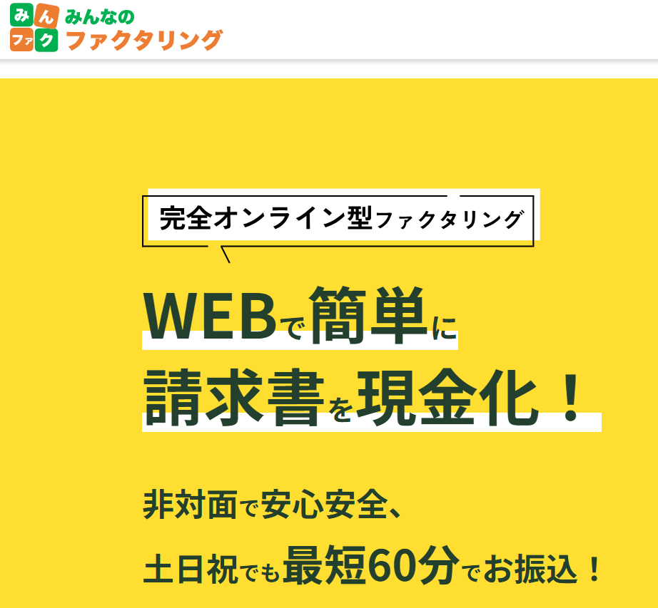 みんなのファクタリングは、個人事業主や中小企業向けに特化したファクタリングサービスを提供しています。オンライン完結型で、最短即日入金が可能。柔軟な審査と低手数料が魅力で、初めての方でも安心して利用できます。