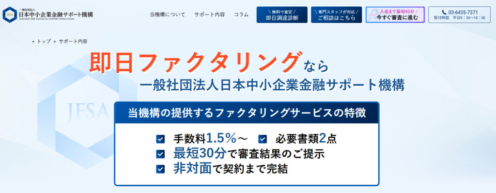 日本中小企業金融サポート機構は、経営革新等支援機関として認定された非営利団体が運営するファクタリングサービスです。通常型とAI型の2種類があり、最短40分~3時間で資金調達が可能。全国対応で、書類2点のみでオンライン完結。手数料は業界最低水準の1.5%~。累計13,000社以上の支援実績を誇ります。