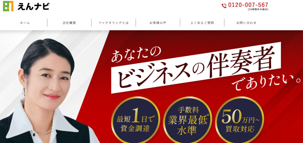えんナビは、24時間365日対応のファクタリングサービスを提供。個人事業主や赤字企業でも利用可能で、最短即日で資金調達が可能。秘密厳守と柔軟な審査が魅力です123。