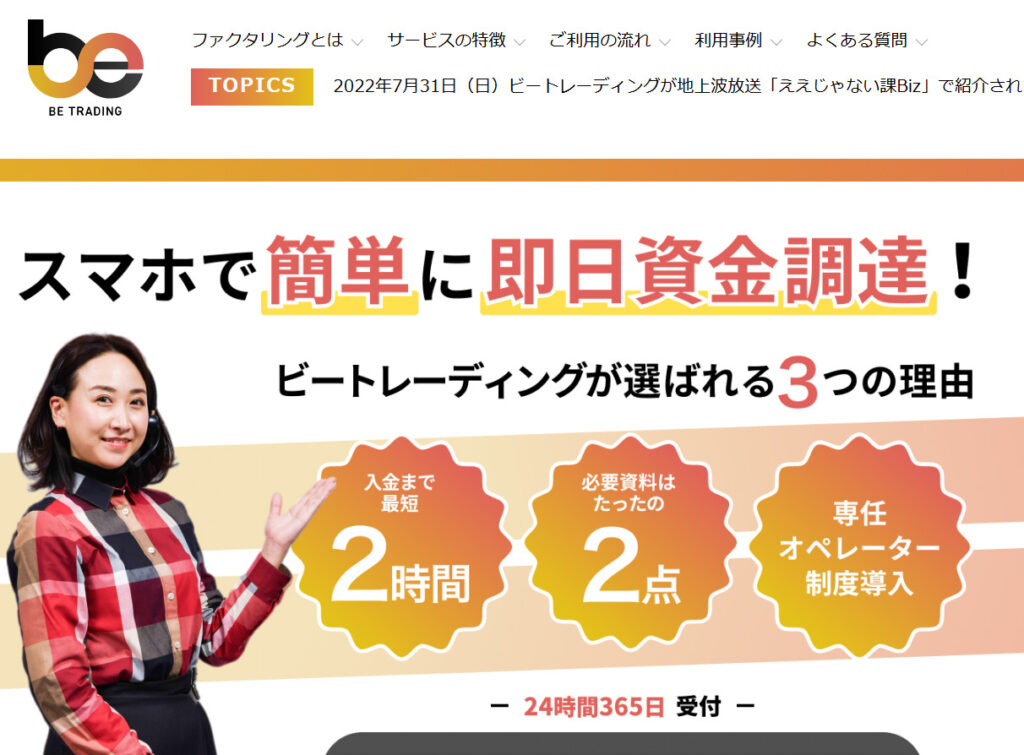 ビートレーディングは、全国対応のファクタリング業界大手です。2社間・3社間ファクタリングに加え、診療報酬・介護報酬・注文書ファクタリングなど多様なサービスを提供しています。最短2時間で資金化可能で、提出書類も少なく、オンライン契約で手続きが簡単なのが魅力です。